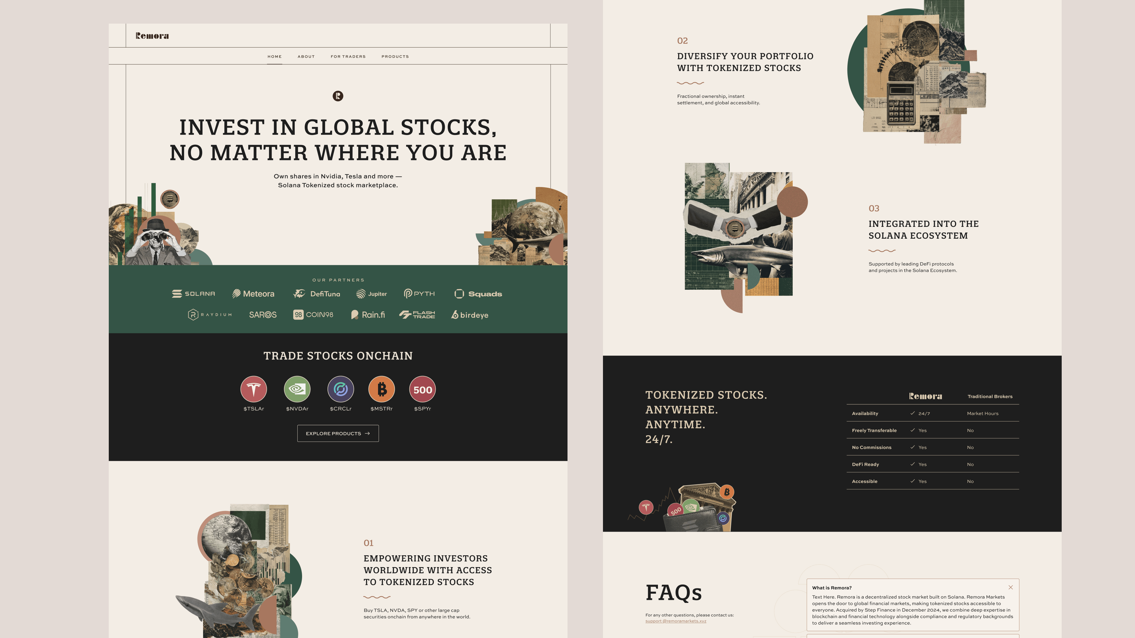 At Remora, I worked on product and brand design for a platform focused on tokenized stocks. I designed key user flows and interfaces for the mobile app and web, helping users discover, trade, and manage tokenized assets. Alongside product work, I helped shape the brand style and visual language, creating marketing materials, graphics, and merch for Breakpoint, while collaborating closely with developers to ensure a consistent design system across the product.