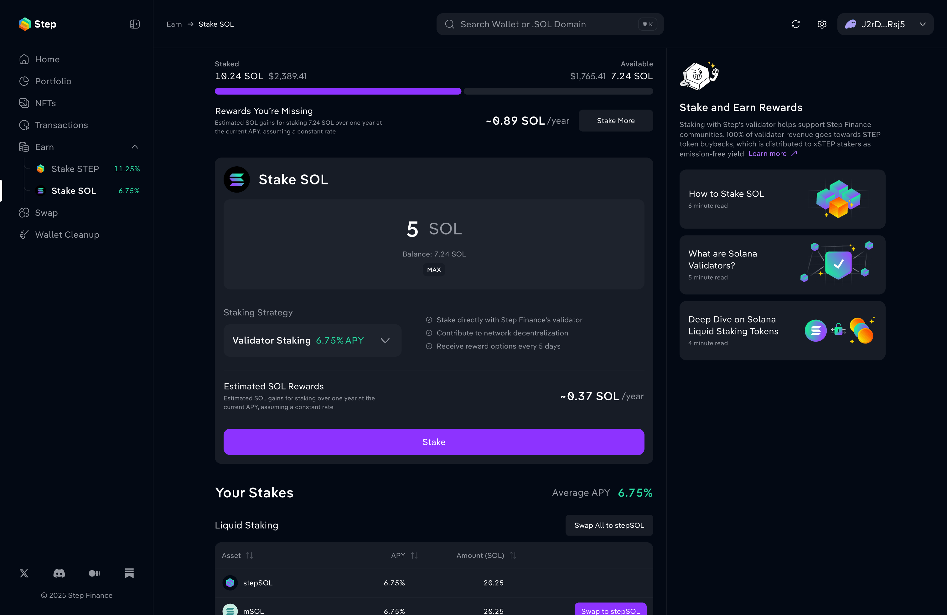 Step Finance is a data and analytics platform for the Solana ecosystem, helping users track portfolios, stake tokens, and manage on-chain assets.